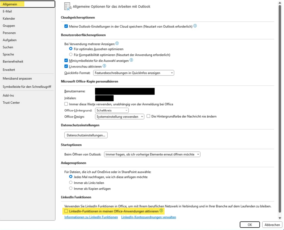LinkedIn-Funktionen, dies sollte deaktiviert sein.