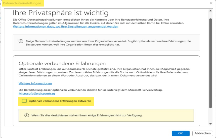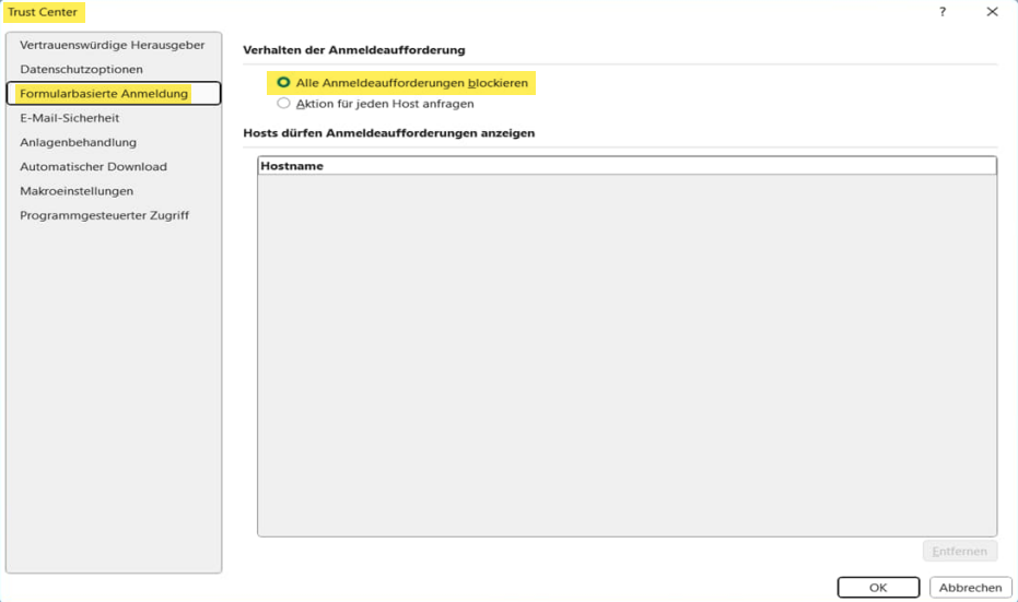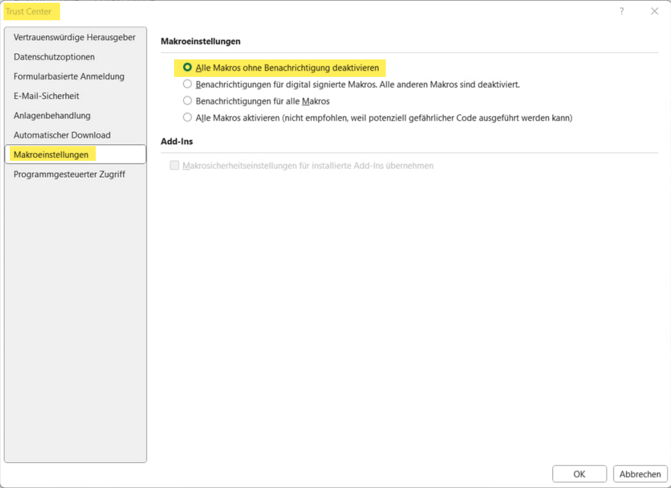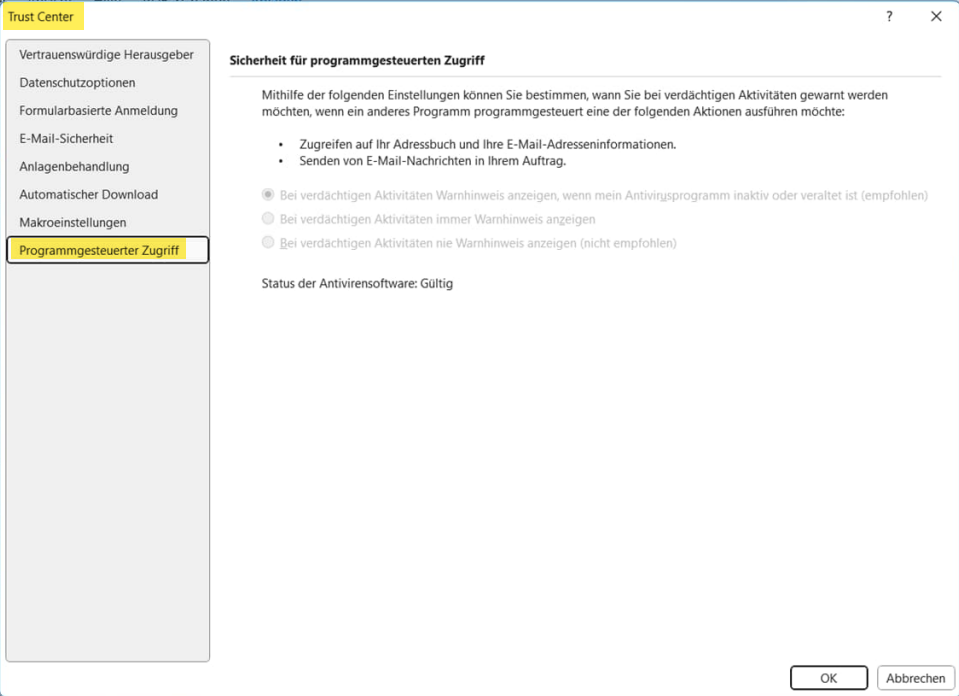 Im Trust Center bleiben und die folgenden Fenster abarbeiten.