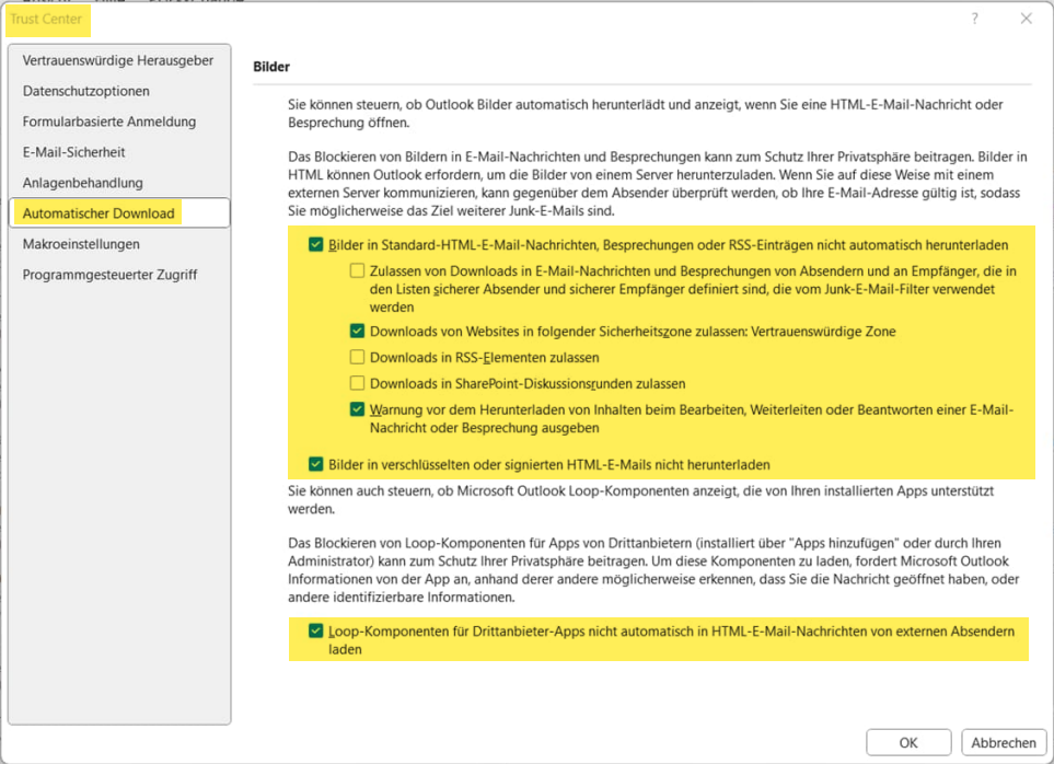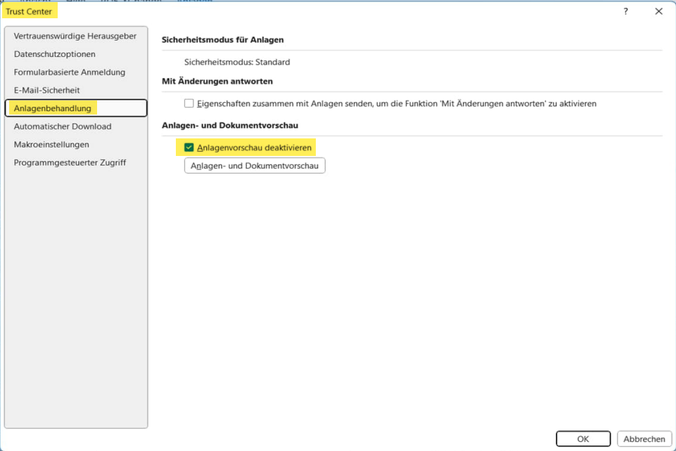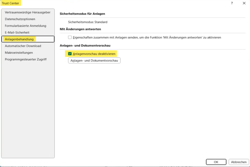 Hier beim Microsoft Outlook-Trust Center die Schaltfläche „Einstellungen für das Trust Center…“