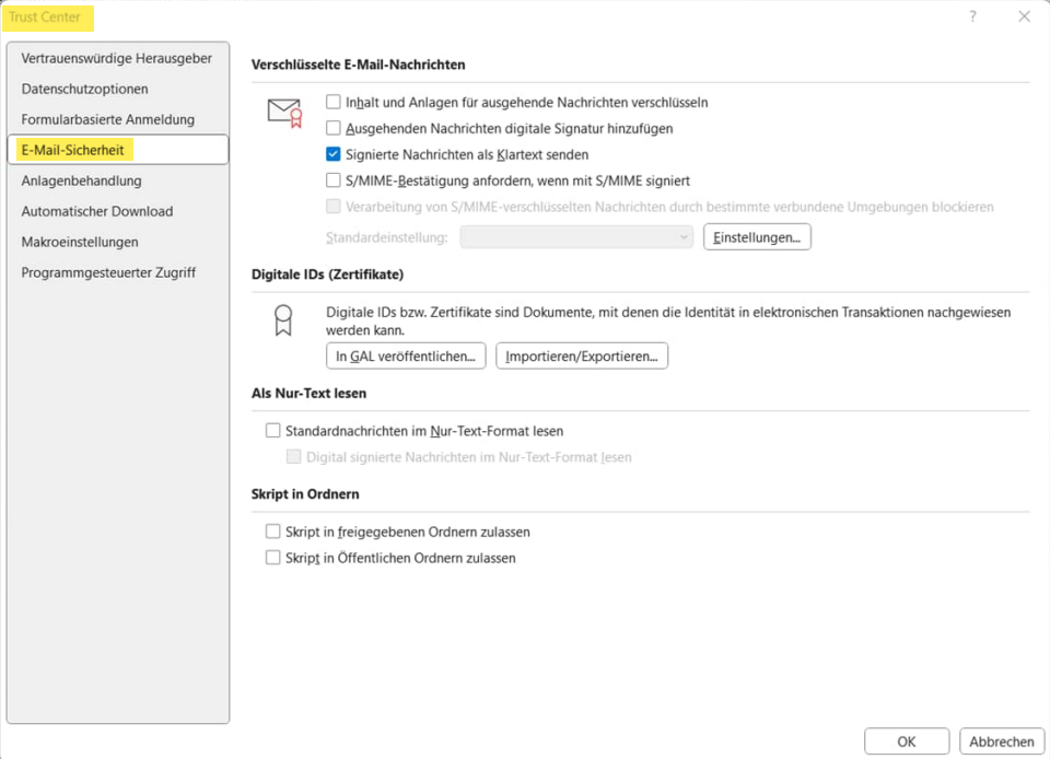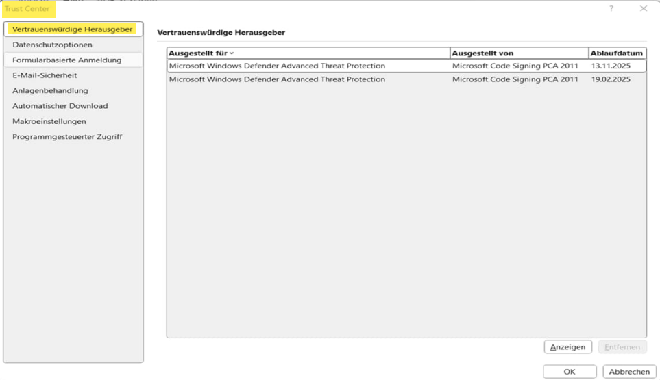 Das sollte dann bei dem Punkt „Vertrauenswürdige Herausgeber“ wie unten aussehen, falls nicht